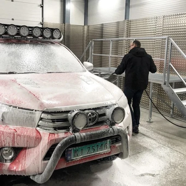 300 liter varmt vatten från en OZO varmvattenberedare och högtryck från en Kärcher. Tvål och kemikalier från Reginol AS