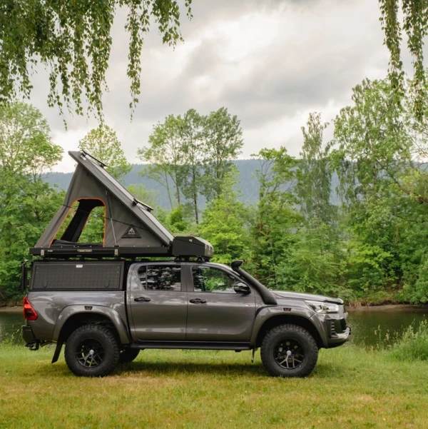 Alu-Cab Gen 3-R är ett mycket kraftfullt tältak som är väldigt enkelt att rigga till camp. Du lyfter upp de två låsbara klämmorna och två gasfjädrar öppnar tältet åt dig.