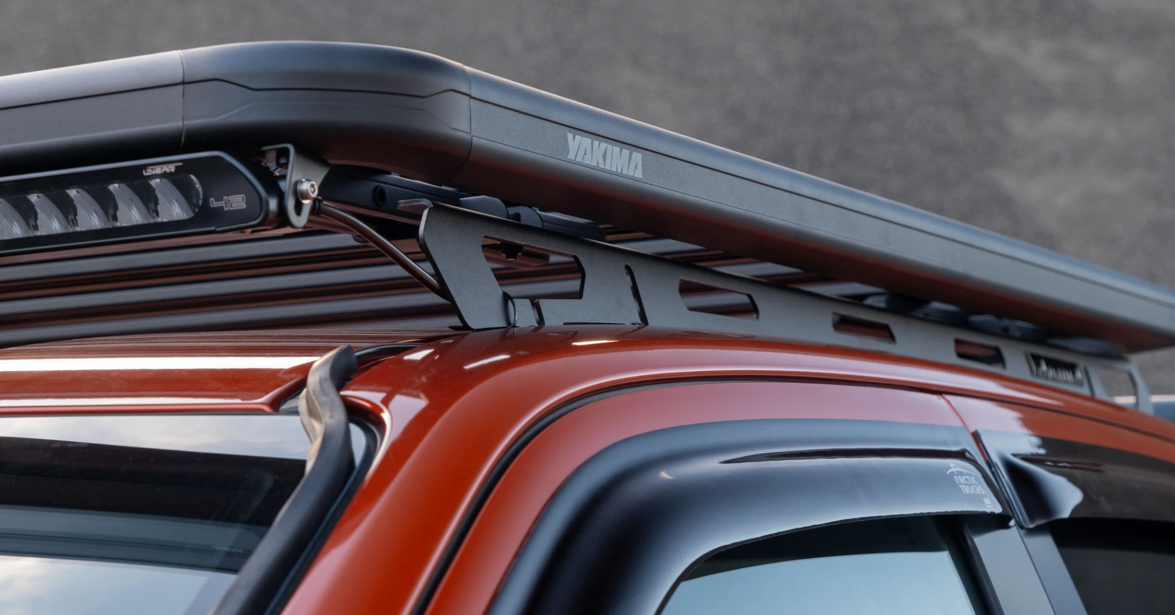 På taket hittar du en Yakima Lockn’Load Platform takrack, på denna bil med dubbelhytt pick-up. Denna finns även självklart för flera bilmodeller. Monterad finns en Lazer 42” LED-bar som passar perfekt på undersidan.