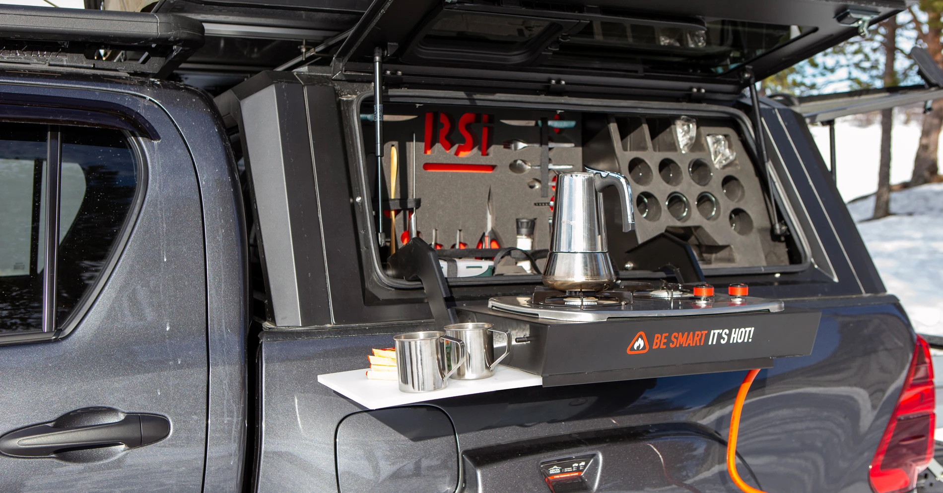 Om du använder bilen som en kompakt husbil på jakt- och fisketurer eller om detta är din arbetsbil – lösningarna kan vara desamma! RSI Smart Canopy har moderna planlock som är tillverkade i pulverlackerat rostfritt stål. Den har lösningar som bland annat fönster och övertryckslist på taket. Vill du organisera verktyg eller förbrukningsmaterial har RSI Smart Canopy låsbara lådor (höger). De levererar dessutom komplett kökslösning med en utfällbar gasbrännare och allt du behöver för att tillaga och äta den mat du serverar på campingturen eller lunchen på arbetsplatsen (vänster).