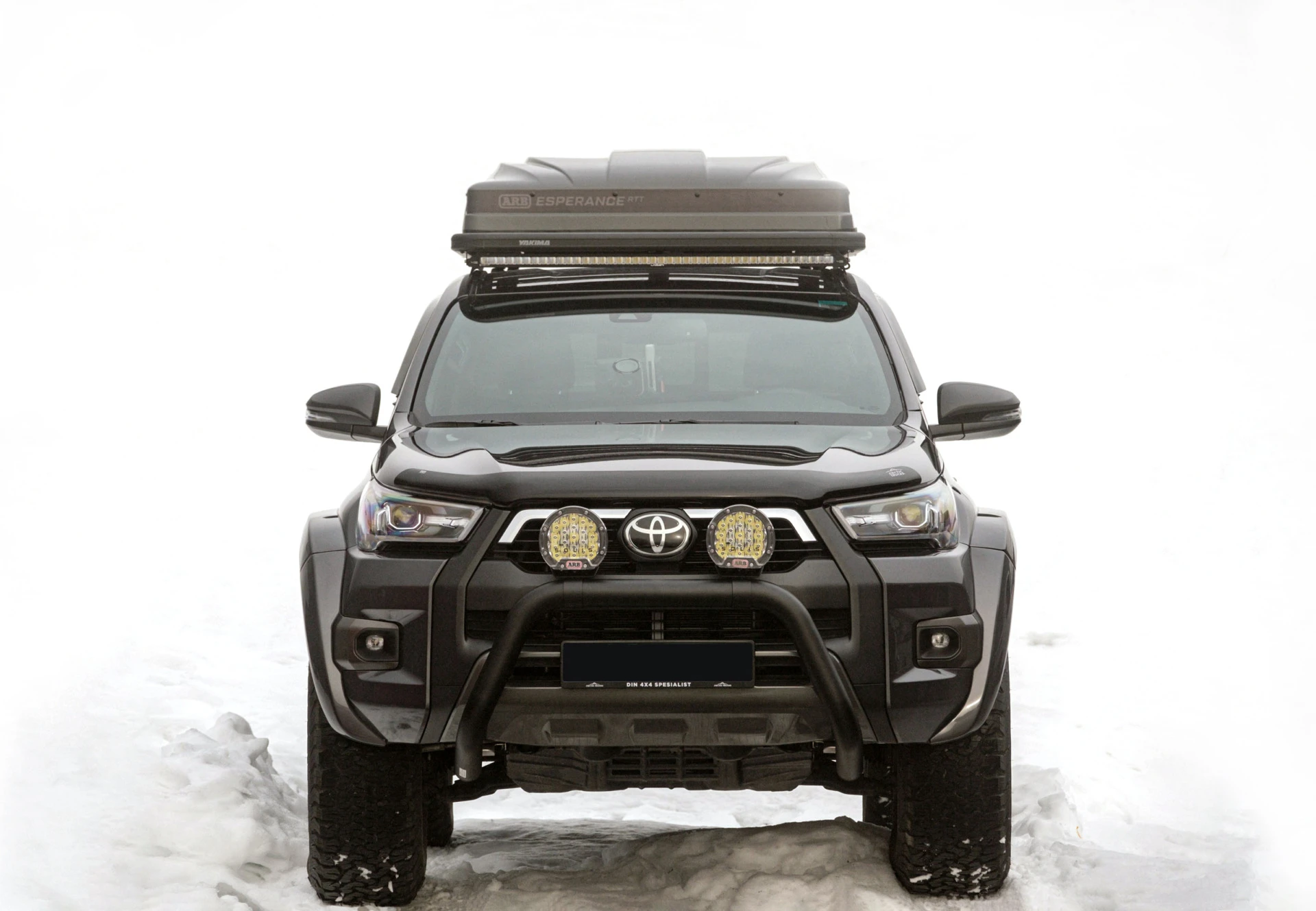 Lamporna är fästa med rostfria och pulverlackerade ljusklämmor som passar perfekt på den svarta Arctic Trucks frontbygeln – skruven till lampan håller klämman på plats på bygeln.